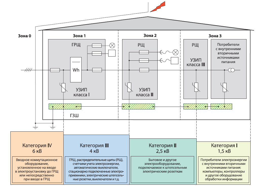 Электроустановка здания разделяется на зоны, защищаемые УЗИП соответствующих классов. Задача такого разделения: ступенчато снизить уровень перенапряжения так, чтобы более мощные устройства гасили основную волну перенапряжения, а по мере ее продвижения по распределительной сети устройства низшего класса дополнительно снижали ее воздействие, обеспечивая минимум в точке подключения потребителей.