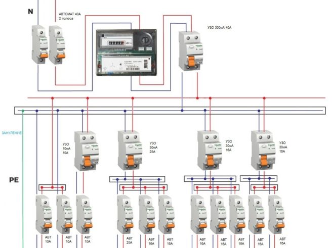 Схема усложнена оборудованием каждой электролинии отдельным прибором УЗО. Это необязательно, однако дублированную защиту рекомендуется делать для дополнительного предохранения от токов утечки