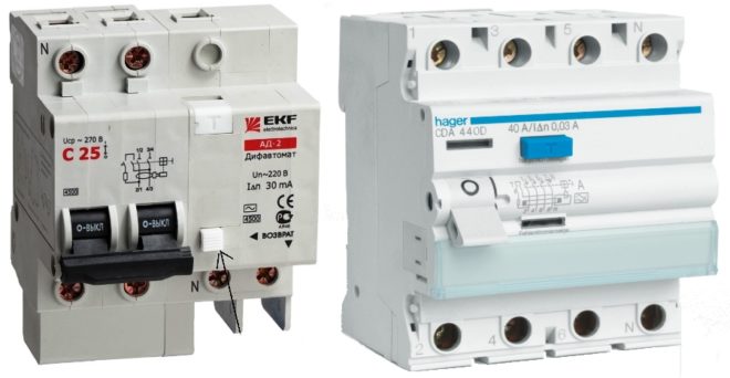 УЗО (слева) не нужно путать с дифавтоматом (справа), который объединяет функции автоматического выключателя и защитного устройства отключения, то есть может срабатывать как от перегрузки, так и от тока утечки