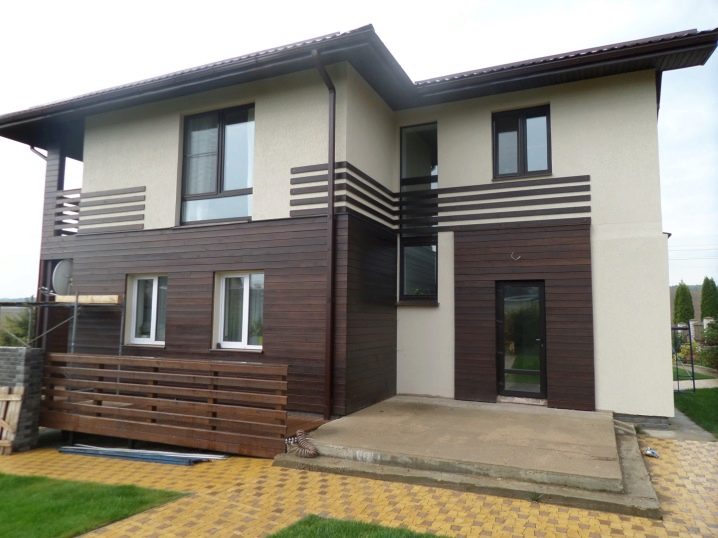 Модной и актуальной тенденцией является отделка загородных домов в стиле шале. Фасад такого строения вместе с внутренней отделкой выполняется из деревянного бруса. Дорогой натуральный материал сейчас можно заменить качественным аналогом – вагонкой блок-хаус. Материал прекрасно имитирует деревянный сруб, подчеркивая красоту и эстетичность. Морозостойкая пластиковая продукция не выгорает на солнце и неприхотлива в обслуживании.