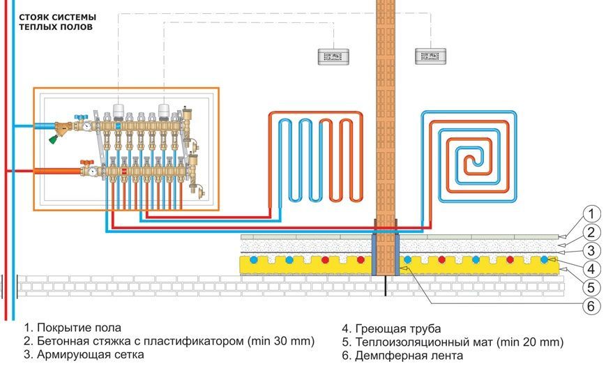 После определения ключевых параметров может разрабатываться схема, на которой в точном масштабе определяется наиболее рациональная укладка труб. После этого делается расчет их общей длины. Одновременно продумывается, где будет размещаться насосно-смесительный узел и элементы управления.