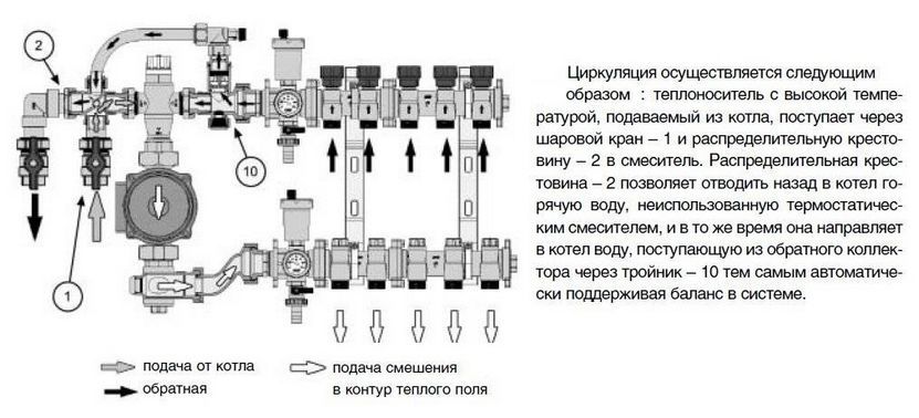 Правильно смонтированный в коллекторный шкаф прибор при поступлении в него горячего теплоносителя разделяет потоки, направляя к зонному вентилю, оборудованному термостатом. После того, как происходит смешивание горячего и охлажденного потока до достижения рабочей температуры, теплоноситель через системный смесительный насос поступает обратно и расходится по подсоединенным контурам водяного пола.