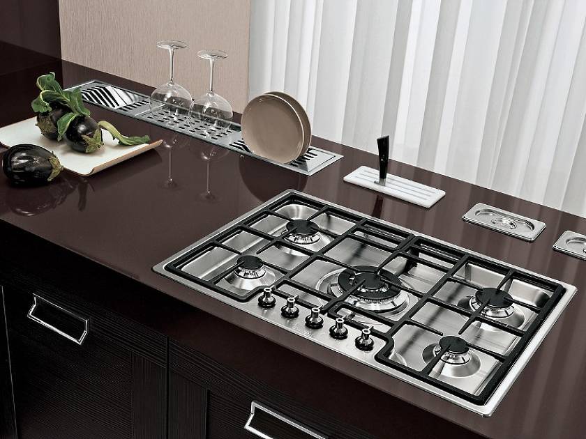 Современная встраиваемая плита также может создаваться по технологии «газ на стекле». По свойствам эти панели напоминают изделия из стеклокерамики. Здесь используется сочетание защитных и закаленных стекол. В уходе эти поверхности относительно просты и выигрышно смотрятся в дизайне кухни – как высокотехнологичное современное решение.
