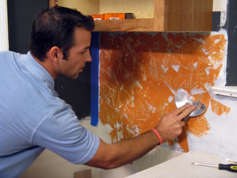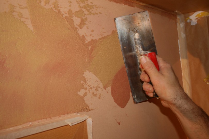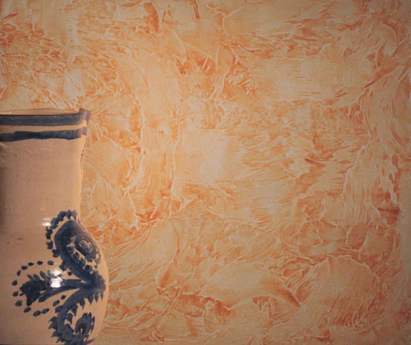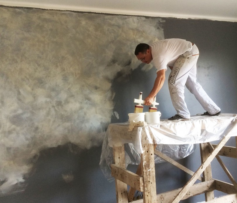 Второй слой венецианки наносится короткими перекрестными движениями, так называемой «бабочкой». Такое нанесение образует характерные прожилки. Высохший слой шлифуется шпателем или теркой.