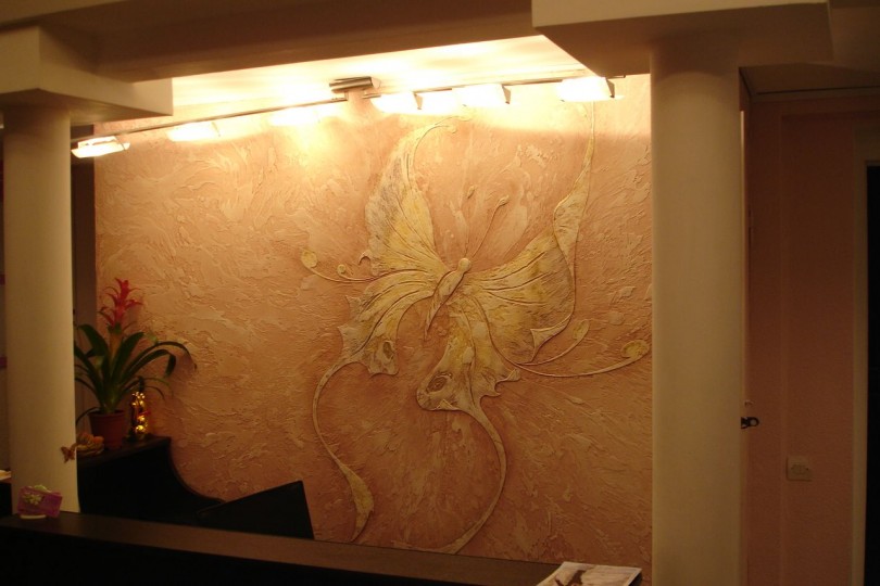 Мастера могут использовать различные техники нанесения штукатурной массы и её разглаживания. «Бабочка» – способ, которым пользуются, нанося второй слой штукатурки, когда движением в одну сторону наносится сама масса, а движением в другую снимается лишний раствор. Нужно, чтобы мазки раствора имели рваные края наподобие мазка кисти. Тогда стыки не будут ровными. В итоге рельеф, который образовался при нанесении первого базисного слоя, исчезает, и появляются прожилки, свойственные мрамору, ониксу и прочим камням.