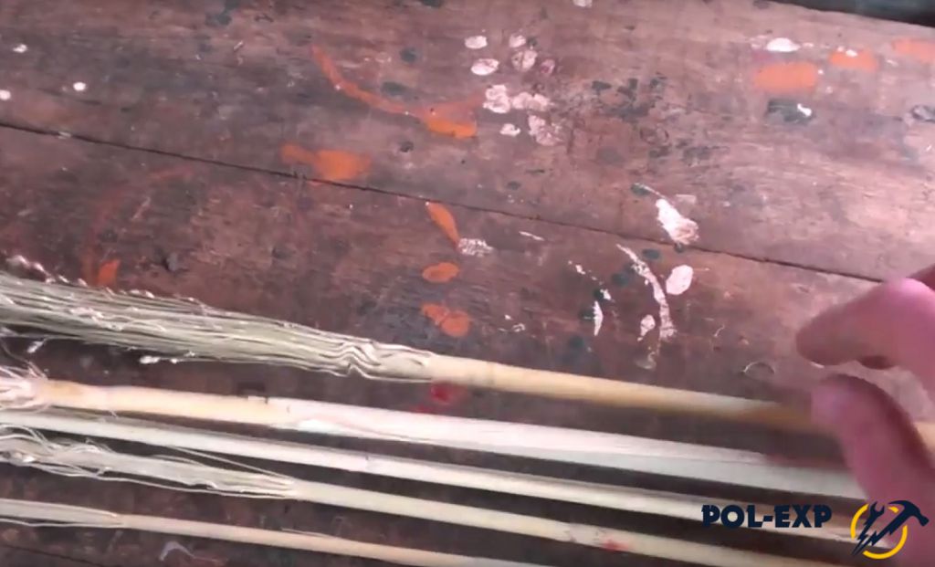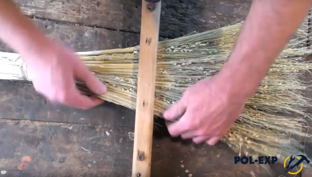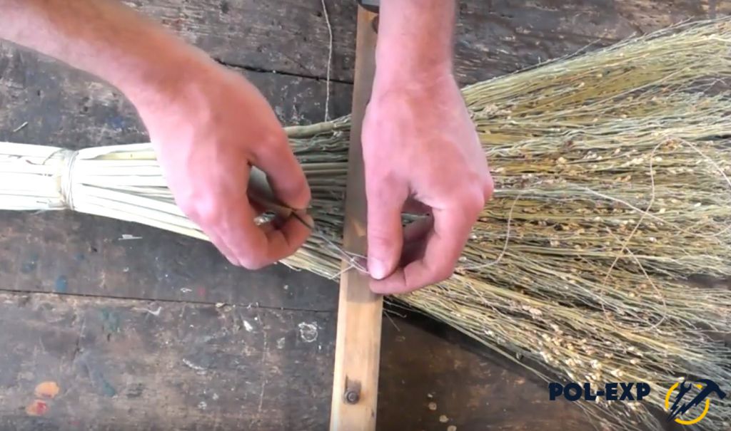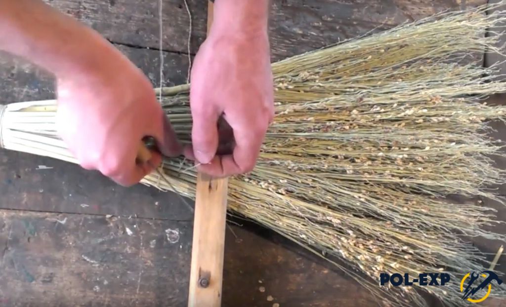 После этого берется капроновая нить и проводится через середину пучка сорго. В месте расположения каната нить обматывается вокруг будущего веника. Кончики нитки после обмотки завязываются. Концы после завязывания еще раз пропускаются через середину пучка и подтягиваются. Излишки ниток обрезаются.