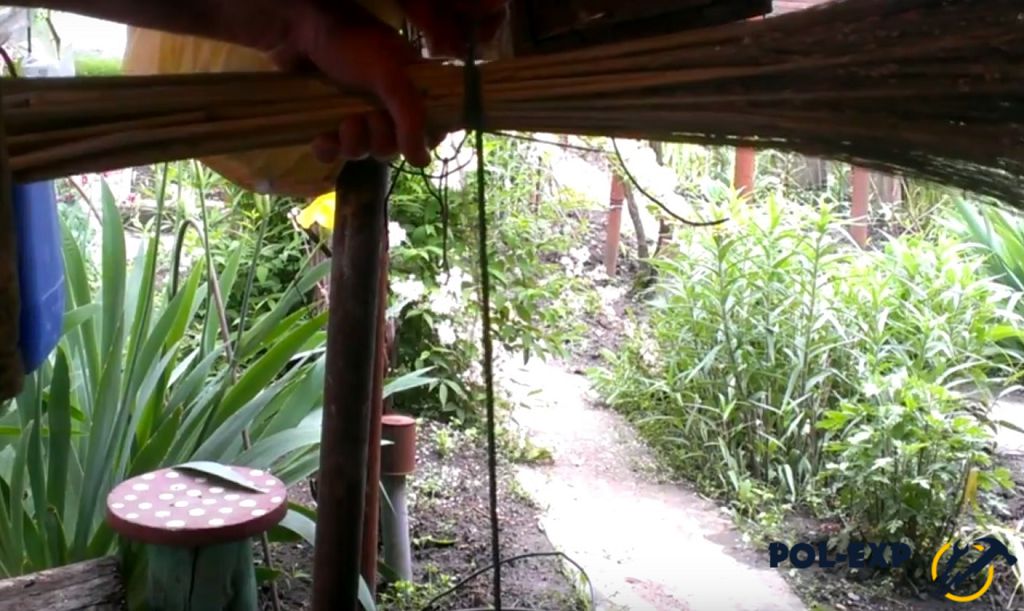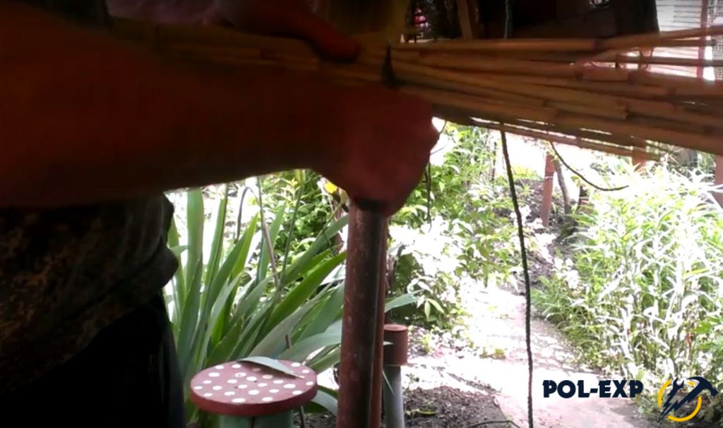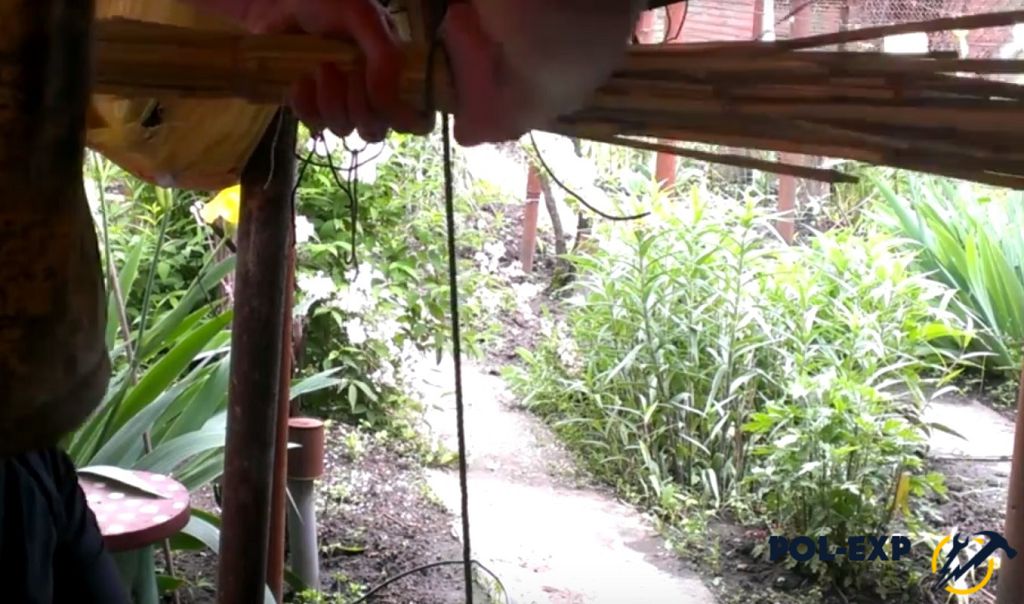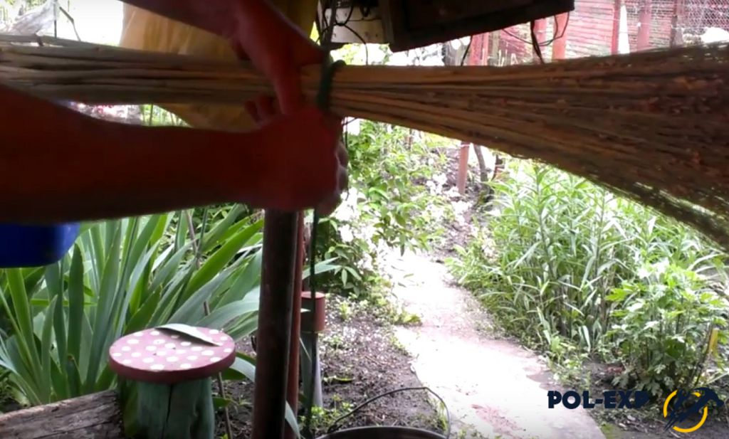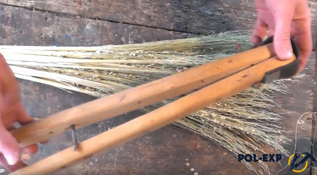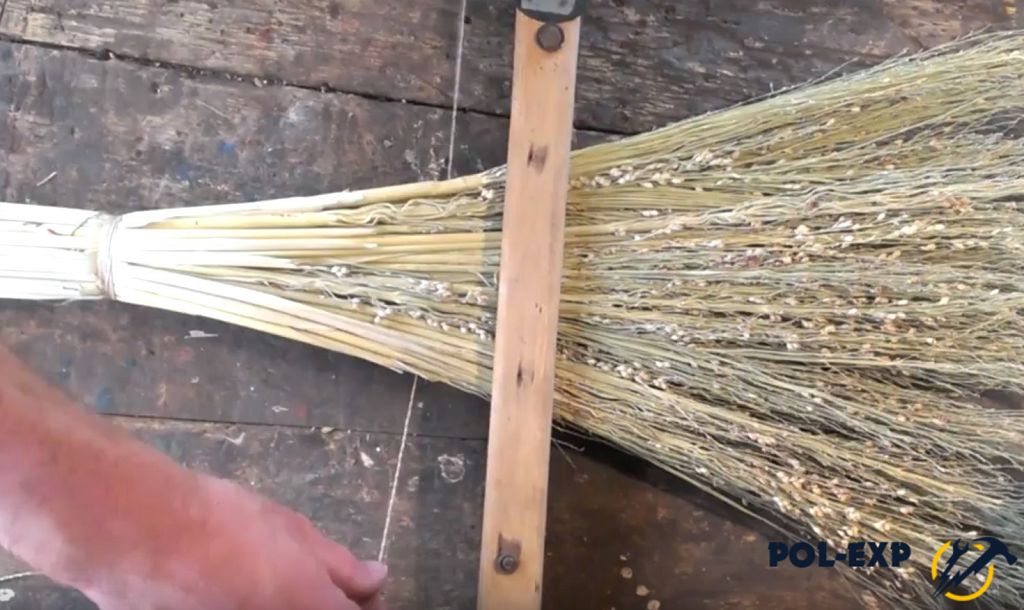Берется пучок сорго, выбирается место, где будет располагаться первый узел, а далее вокруг этого места делается петля из подвешенного каната. Канат фиксируется нажимом ноги на рычаг. Канат натягивается и дает возможность как можно плотнее стянуть веник, который в это время вращается на пол-оборота.