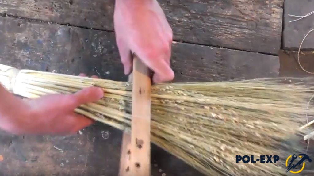 Пора формировать веник. Сначала создается ровная рабочая поверхность метелки. Для этого все стебли сорго укладываются аккуратно на ровную поверхность. При этом маленькие веточки должны находиться внутри веника, снаружи укладываются большие и мощные стебли.