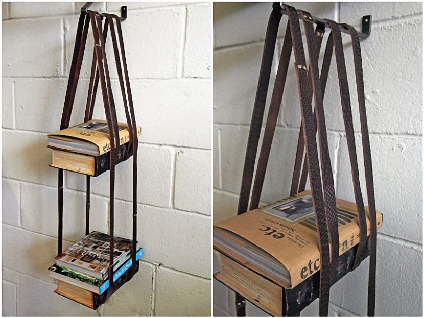 Обрезаем ремни по необходимой длине. Охватываем ремнем ветку дерева. В месте обхвата сшиваем ремень. Те же манипуляции проводим со вторым концом ремня. Из кусочка жесткой кожи изготавливаем декорирующие ремешки, одеваем их на места сшива ремней. Дыроколом для кожи в верхней части ремней проделываем отверстия. В стену или потолок вкручиваем крючки, за отверстия подвешиваем на них ремни.