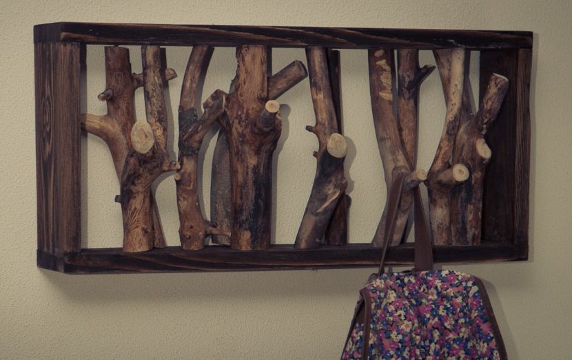 Ветки и срезы прекрасный материал для вешалки. Дерево всегда модно, всегда можно найти обрезки веток, не дорого при производстве.