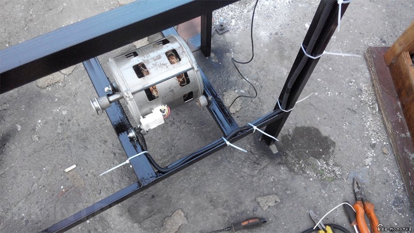 - бывший в употреблении или новый мотор мощностью до 1000 Вт. Он способен передавать вибрацию столешнице с габаритами 0,8х1,5 м. На приводном валу электродвигателя необходимо закрепить два эксцентрика, угловое положение которых можно изменять. Это позволит регулировать амплитуду и силу колебаний;