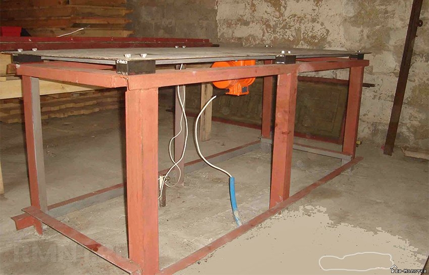 - Оптимальные размеры основания стола — 70 смx70 см, однако каждый мастер вправе изготовить стол таких размеров, которые соответствуют его потребностям. Чем больше объем производства, тем, соответственно, шире должна быть вибрирующая поверхность стола и мощнее двигатель. Основание легко сделать из металлического уголка (достаточно 50×50 мм) или швеллера. Отдельные элементы его можно соединить при помощи электросварки или болтов. В последнем случае конструкция получится разборной. Это удобно, если вы собираетесь перемещать ее с одного объекта на другой. Однако болты имеют свойство расшатываться, поэтому жесткость конструкции уменьшится.