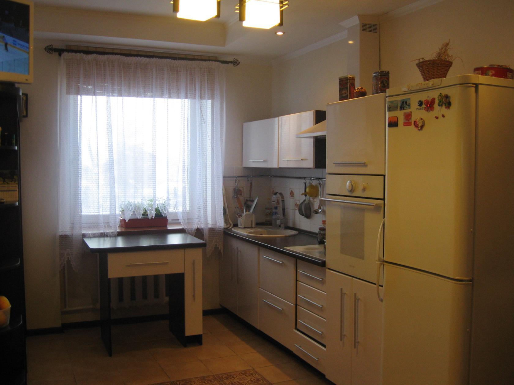 Угловой гарнитур в классическом стиле с фасадами из пленочного МДФ. Размер помещения – 9 кв.м., габариты гарнитура 2,8х1 м. Стоимость – 4500 долларов.
