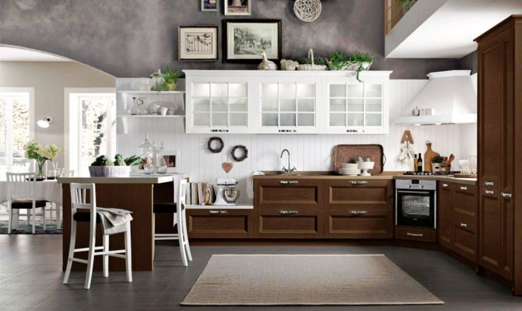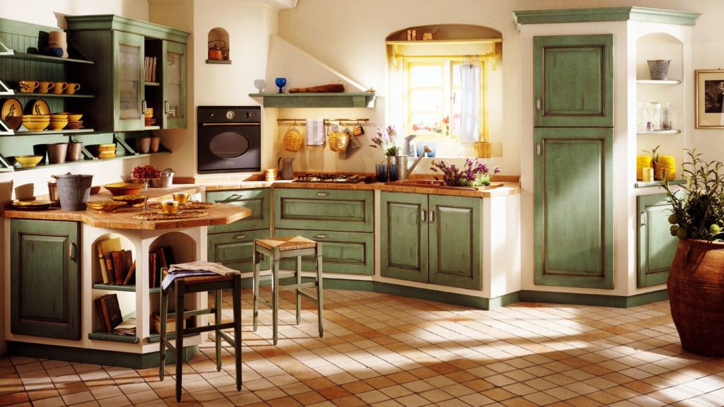 популярный для кухонь стиль кантри (деревенский) предполагает использование натуральных материалов, но приветствуются и другие фактуры, замаскированные «под дерево». Желательно, чтобы в мебели преобладали теплые оттенки, создающие атмосферу уюта – темно-оранжевый, коричневый, зеленый и ореховый;