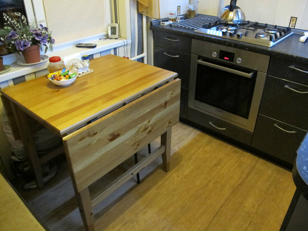 Вторым вариантом является использование складного или выдвижного стола. Опять же его можно прикрепить к подоконнику. Также есть возможность установить небольшой стол и к нему приделать выдвижную столешницу. Кроме того возле свободной стены можно установить складной стол и разлаживать его только при необходимости, например, во время приема пищи.