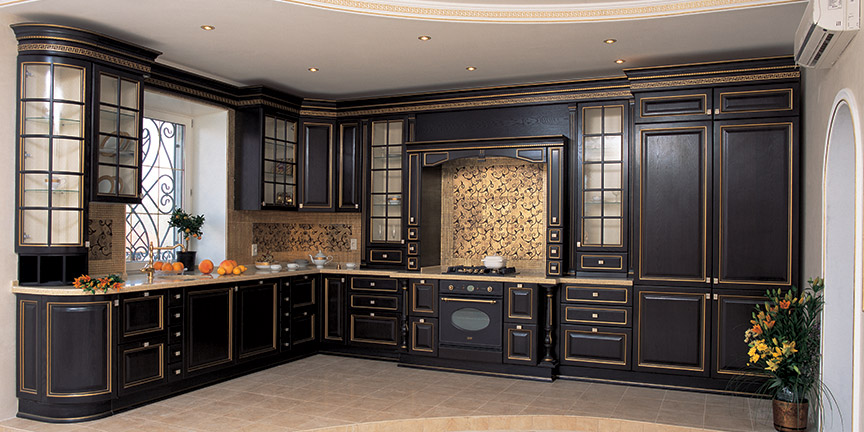 Ведь именно так выглядит большинство классических итальянских, немецких, испанских, французских и английских кухонь. Толщина и массивность дверных фасадов подчеркивается углубленными порталами и узкими витринами, украшенными резными орнаментами. Каждый кухонный модуль обособлен колоннами, являющимися атрибутом стиля. Композиции строятся от центра, которым обычно выступает плита, симметрично, согласно строгим классическим канонам, но без свойственной ампиру излишней помпезности. Все выглядит очень солидно и дорого!