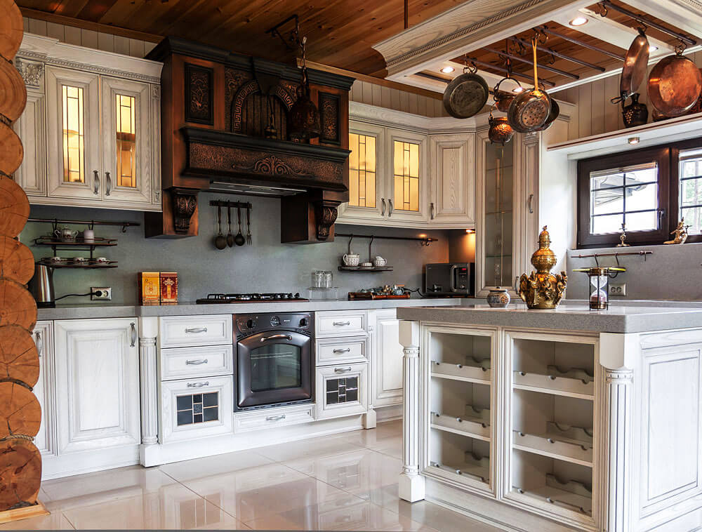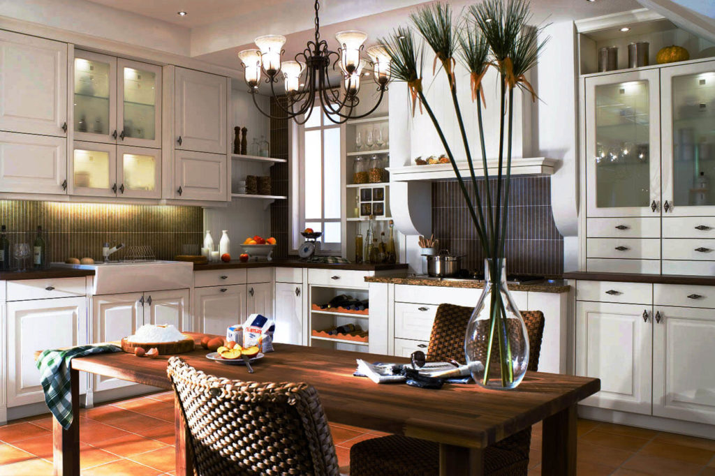 Чтобы кухонный интерьер приобрел законченный облик, дополните его большими красивыми вазами с росписью, маятниковыми часами, фарфоровыми и каменными скульптурами, столовыми принадлежностями в обтянутых бархатом футлярах.