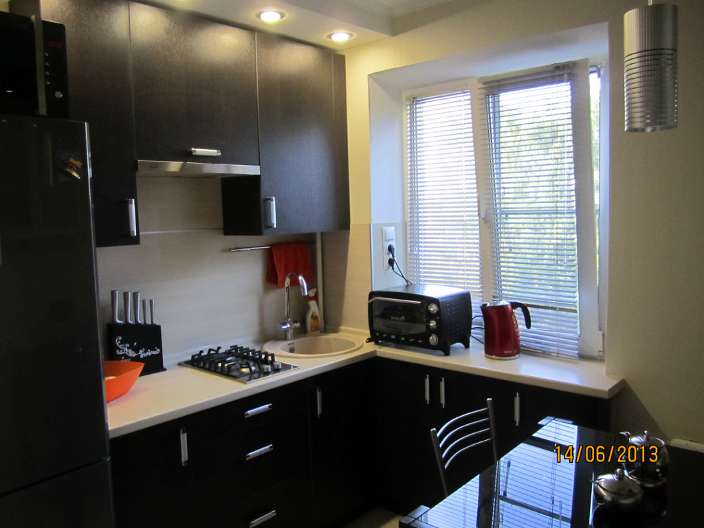 Угловая кухня цвета темного дуба в современном стиле. Нижние фасады – МДФ+ПВХ, верхние фасады – крашенное, осветленное бельгийское стекло в рамке из полированного алюминия. Размер кухни 1,95х3 метра. Стоимость – 2500 долларов.
