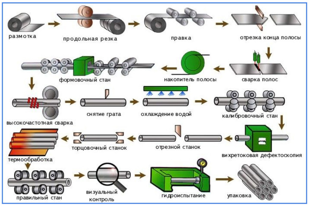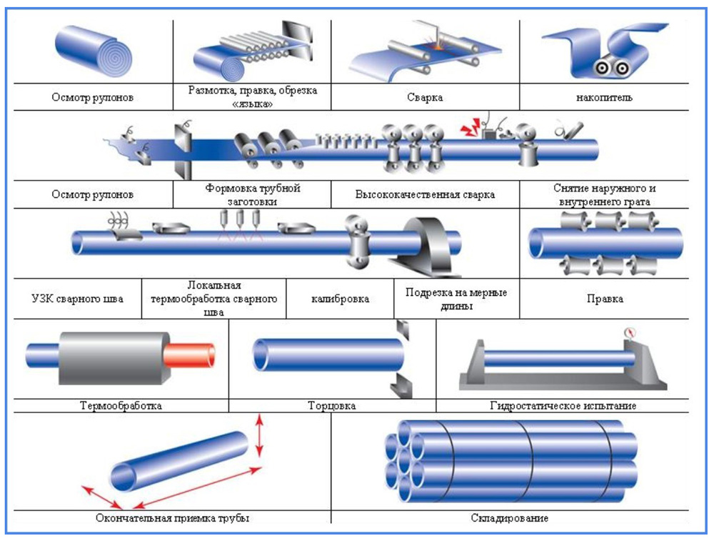 Технологический процесс производства прямошовных электросварных нефтегазопроводных и обсадных труб состоит из следующих этапов: