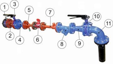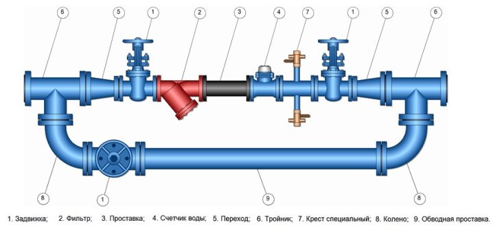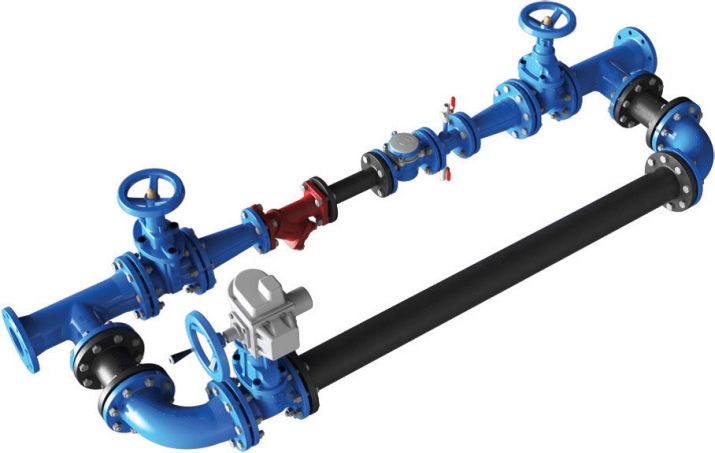 С помощью запорной арматуры перекрывается доступ воды в дом из центральной магистрали. Она используется при демонтаже счётчика или полном сливе системы. Сетчатый фильтр необходим для доочистки поступающей во внутреннюю систему воды от примесей, возникающих в результате коррозийных изменений в трубах или аварийных ситуаций на водопроводной станции. Фланцевые патрубки используются для монтажа отдельных участков системы. А остальные соединительные элементы выполняют вспомогательную функцию.
