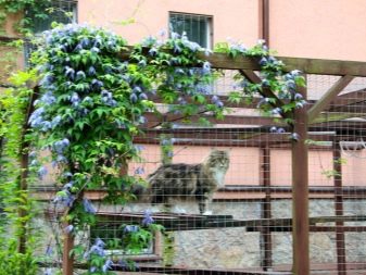 - Стены выполняют из сетки Рабица, при этом размер ячеек подбирают таким образом, чтобы в них не могла застрять кошачья лапка.