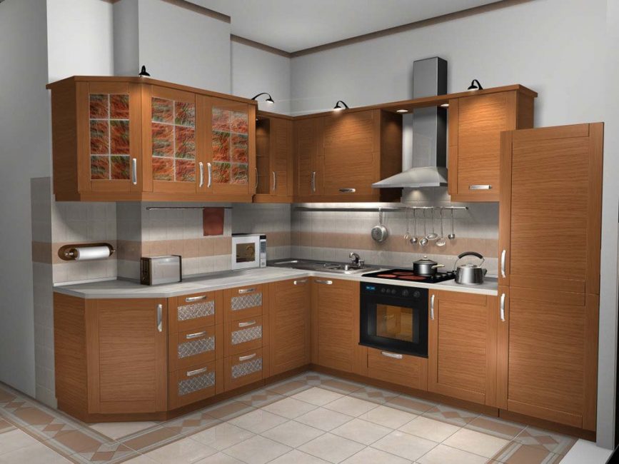 Еще один важный момент, на который стоит обратить внимание при планировке угловых кухонь – это цветовая гамма. Для малогабаритных помещений лучше выбирать белые, светло-бежевые и светло-голубые оттенки