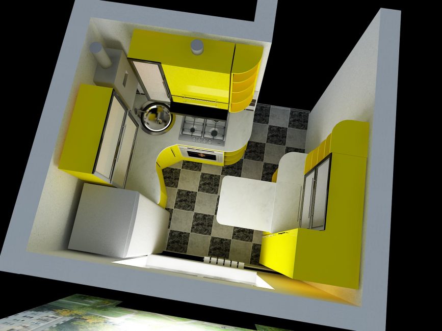 У стены, прилегающей к входной двери, ставится узкий холодильник и одна секция гарнитура. Затем идет угловая тумба под мойку, и на смежной стене можно свободно разместить еще 2 секции шириной 40-50 см, а за ними плиту. Над нижними шкафами во всю длину обеих стен устанавливаются подвесные, таким образом, остается место для столешницы и множество полочек для размещения посуды и других предметов, необходимых на кухне. Оставшегося места в центре хватит для размещения небольшого обеденного стола для 2 человек.