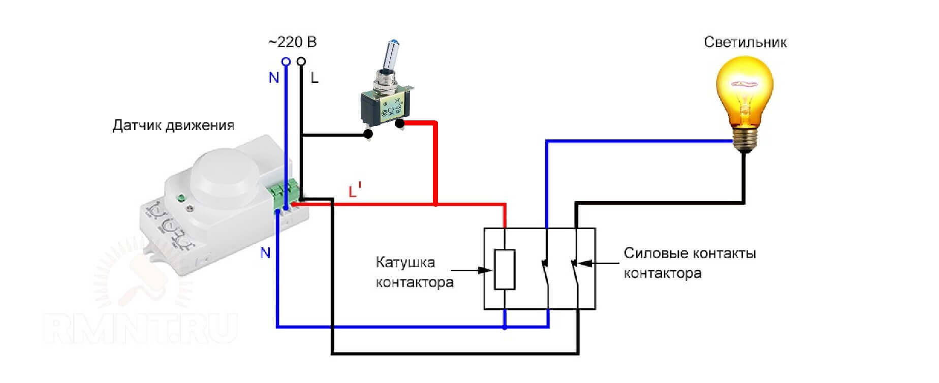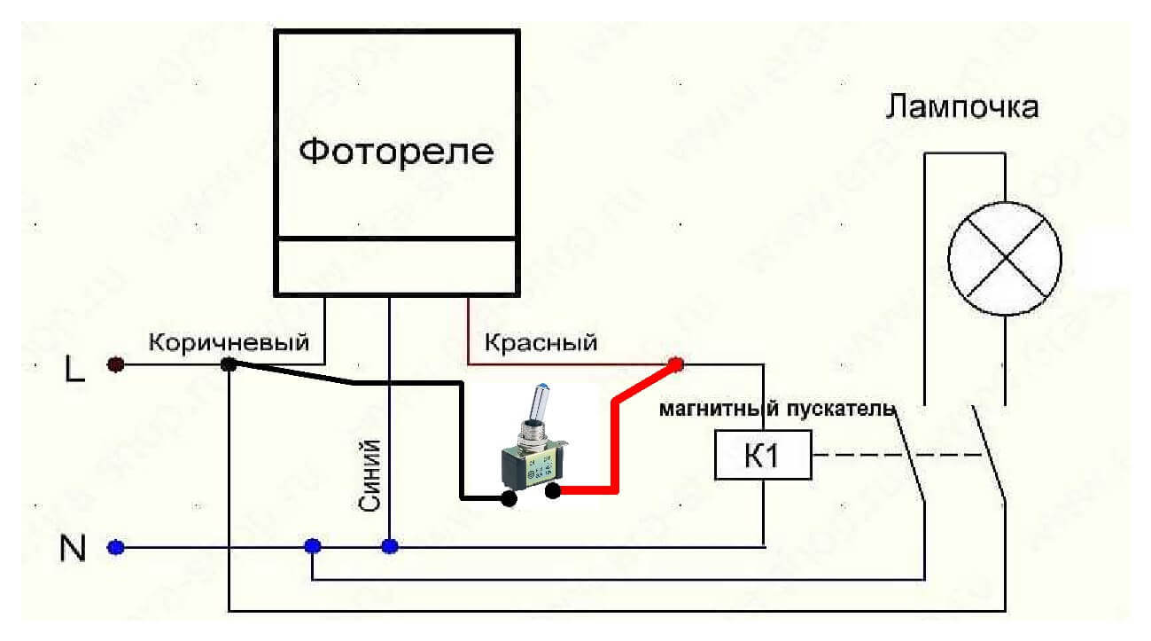 Схемы можно совместить, организовав принудительное включение освещения, для этого параллельно сигналу с датчика устанавливаем тумблер, который будет подавать фазу на катушку.