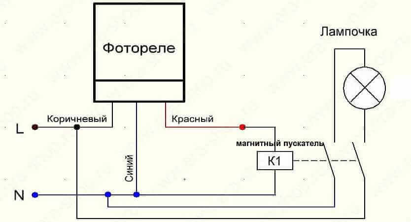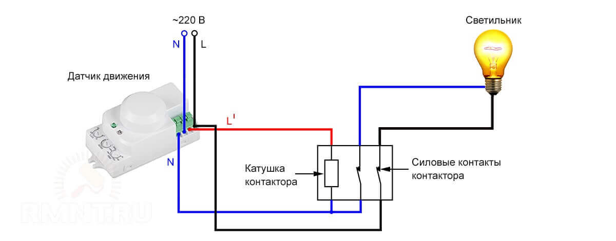 Для этого схема включения освещения контактором или пускателем с помощью датчиков отличается от схемы с кнопочным постом лишь тем, что вместо кнопочного поста мы соединяем катушку коммутационного аппарата с контактом выходного сигнала датчика. Ниже вы видите схему подключения датчика движения и фотореле к контактору на примере однофазной сети: