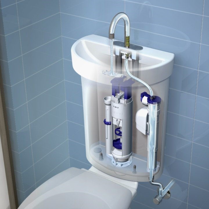Еще один вариант совмещения для маленьких санузлов – умывальник, расположенный над бачком унитаза. Здесь возможны две комбинации – либо раковина, частично нависающая над бачком, либо модель, где чаша вмонтирована в бачок. В этом случае возможна дополнительная экономия воды. Использованная во время гигиенических процедур жидкость сливается в бачок и дальше идет для смыва в унитазе.