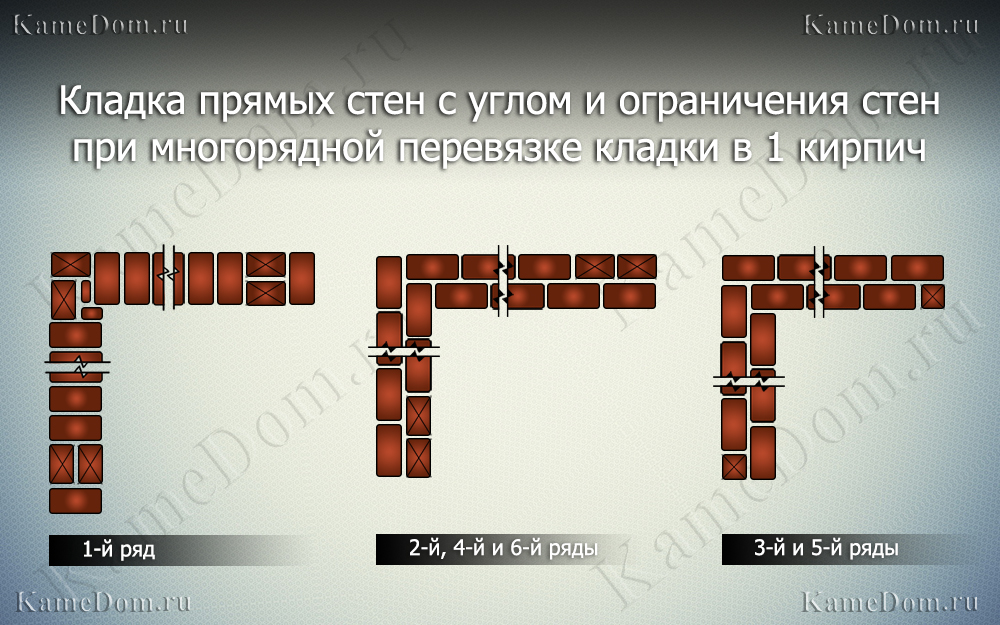 - многорядная – несколько подряд идущих ложковых рядов перевязываются через равные промежутки тычковыми рядами, например для полуторного, тычковый ряд устраивается через пять ложковых, а одинарного – через шесть;