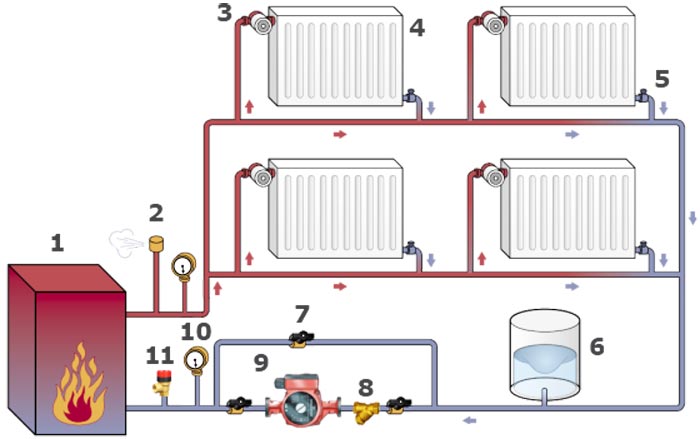 Закрытая схема теплоснабжения предусматривает насос, провоцирующий движение воды по трубам. Принудительная циркуляция также реализуется при помощи труб, котла, радиаторов, расширительного бака. Металлический резервуар герметичен, состоит из двух завальцованных частей, имеет следующее наполнение:
