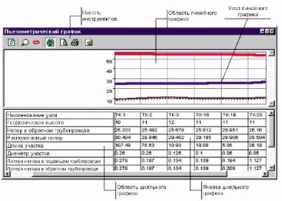 В табличном виде достаточно сложно проанализировать результаты расчета . В программно – расчетном комплексе пользователю должна быть предоставлена возможность иллюстрировать результаты различными графиками или тематической раскраской сети . Например , построением температурного или пьезометрического графика , раскраской тепловой сети по падению температуры теплоносителя или изменению скорости движения воды на участках . В случае работы двух и более источников на одну сеть можно , выполнив тематическую раскраску , определить от какого источника какие потребители получают воду и тепловую энергию .
