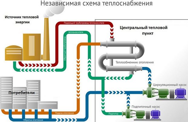 Независимыми системами теплоснабжения называют системы, в которых отопительное оборудование потребителей изолировано гидравлически от производителя тепла, а для теплоснабжения потребителей используют дополнительные теплообменники центральных тепловых пунктов.