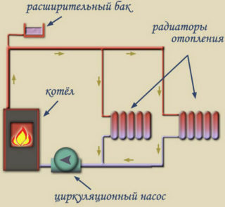 Открытый вариант монтируется без циркуляционного насоса. Теплоноситель направлен по трубам естественным образом. После нагрева в котле до определенной температуры повышается давление, и горячая вода, поднимаясь наверх, выталкивает холодную. Объем воды при нагревании также увеличивается, поэтому излишек идет в расширительный бачок. Остывший теплоноситель снова направляется в систему.
