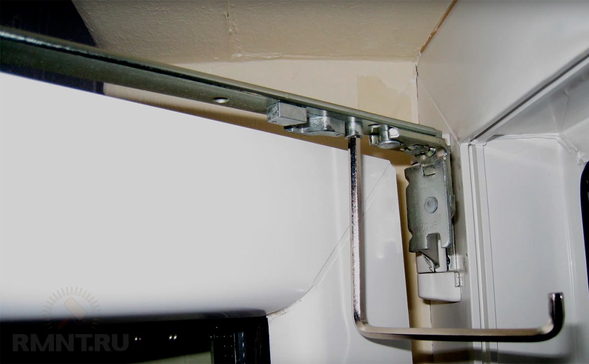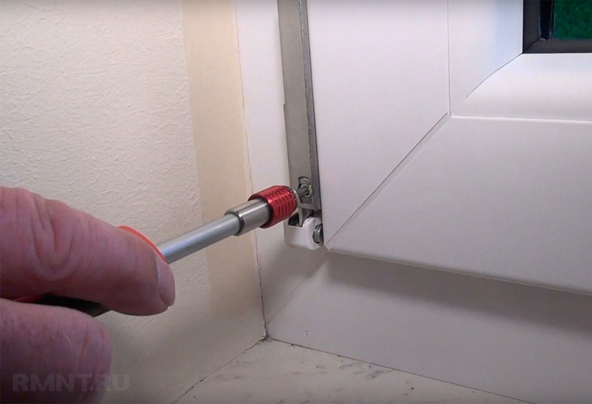 Для прижима верхней петли необходимо будет заранее выставить створку окна в режим «проветривания» (с помощью поворота ручки). Эти действия необходимы для того, чтобы получить доступ к винту, отвечающего за прижим петли. Следует помнить, что окно необходимо будет поддерживать, так как в этом режиме оно висит лишь на одной петле.
