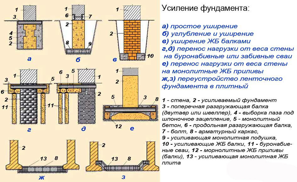 Несколько лет назад из-за попыток сэкономить на строительстве основания отстраивали при помощи кирпича или бута (камня неправильной формы). Так как данные материалы отличаются хрупкость, при их ремонте выполняют замену кирпичной кладки на бетон. Технология усиления предусматривает проведение следующих работ: