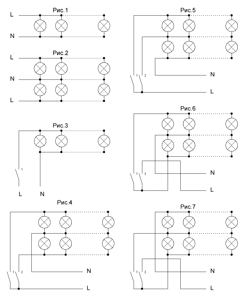 Случай 1 – рисунок 5: внутри люстры все правильно, выключатель подключен правильно, но перепутаны провода на подключении к люстре. При включенной клавише 1 и выключенной клавише 2 будут светиться все лампы, причем не на полную яркость (светодиодные или люминесцентные будут вести себя по-другому). При включенных обеих клавишах будут светиться лампы только одной группы (на схеме нижняя). При включенной клавише 2 и выключенной клавише 1 также будет светиться лишь одна, нижняя, группа ламп.