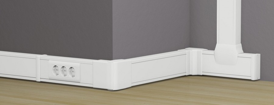 Один из вариантов эстетичного оформления открытой проводки, это проведённая проводка в квартире по полу. В данном случае удобно прокладывать провода в полых пластиковых плинтусах, одновременно выполняющих функцию кабель-каналов.