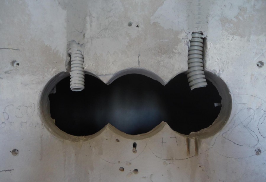 Лунки для подрозетников в кирпичных стенах выбирают коронкой; в бетонных – долотом. Коронка, попав на арматурину, тут же вся осыпается, а стоит недешево. Выемку под ВЩ у счетчика также выбивают долотом.