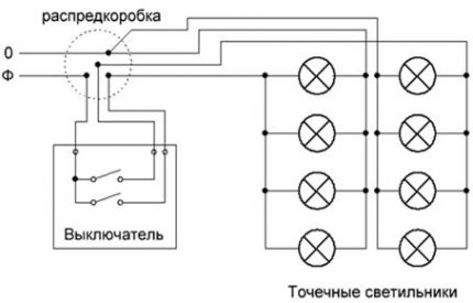 Схема разводки точечных или галогенных светильников 220 В для одного помещения, например, для кухни, детской комнаты или прихожей