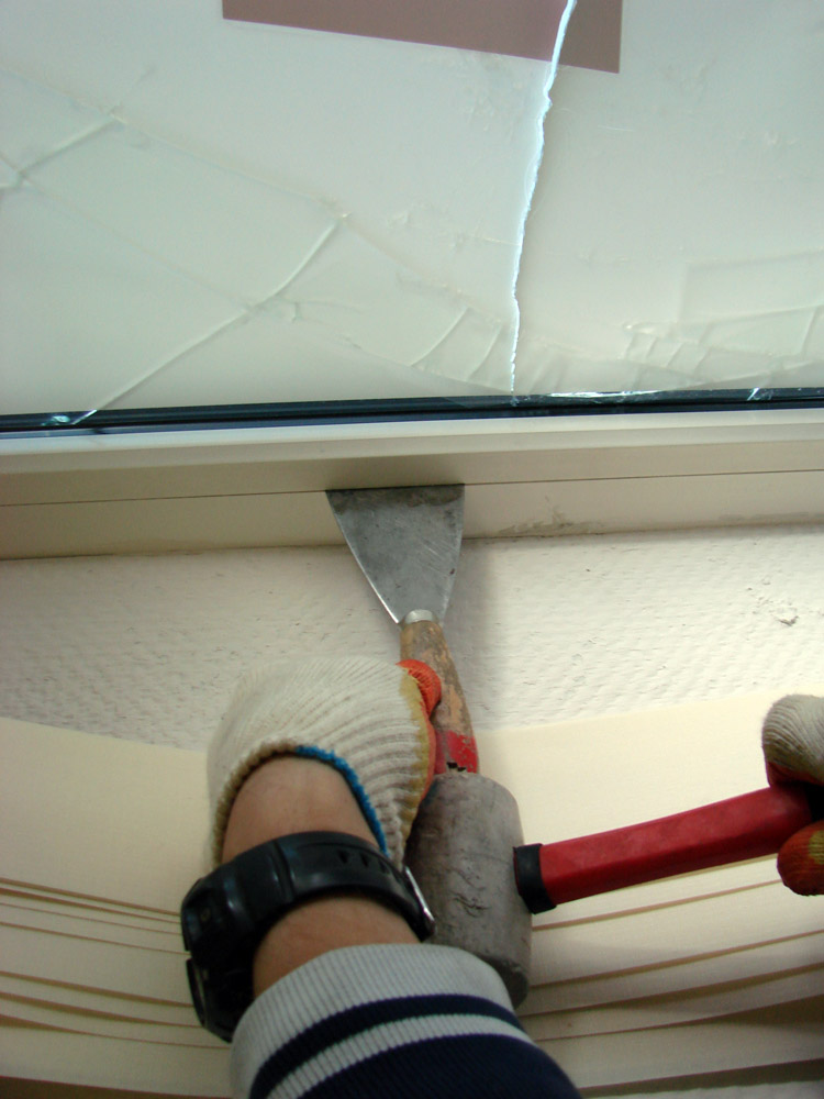 В деле извлечения стеклопакета самое главное — это снять штапики. Делается это при помощи узкого шпателя.