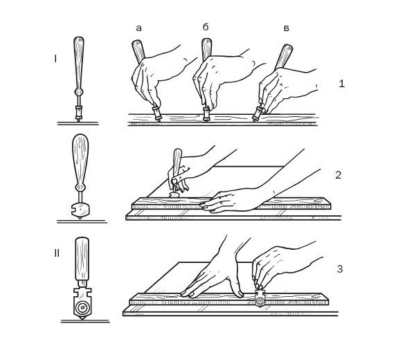 Как резать стекло стеклорезомI — алмазный стеклорез; II – роликовый стеклорез;1 – резка алмазным стеклорезом (а, в – неправильно, б – правильно);2, 3 – резка роликовым стеклорезом
