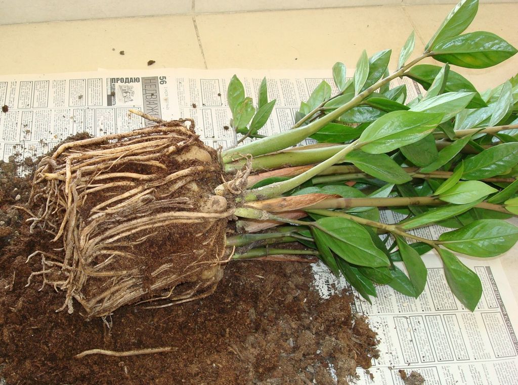 Пересадка производится по мере заполнения корневищем горшка, молодые растения – каждый год весной или летом, взрослые – раз в несколько лет. При пересадке следует учитывать характер роста растения: корневище замиокулькаса, как и любой стебель, имеет точку роста, поэтому в ее направлении необходимо оставить больше места. Иногда растущее корневище сильно деформирует или даже разрывает пластиковую тару, в связи с этим предпочтительнее выбор остановить на глиняном горшке.