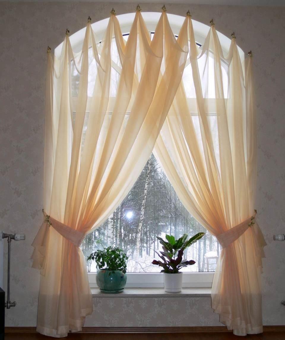 Если оконный проем имеет арочную форму, то вместо карниза для закрепления занавески можно использовать точечное крепление на клипсы или крючки. Сам тюль можно сделать двойным и расположить по обе стороны окна с подхватом.