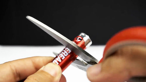 Можно использовать для заточки ножей пальчиковую батарейку. Еще один очень эффективный способ. Правда, здесь есть одно «но», которое заключается в требовании к батарейке. Она должна быть заключена в металлический кожух. Действия производятся точно такие же, как и со скрепкой.