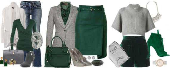 Темный зеленый и серый – мягкое, стильное, выразительное сочетание, в котором зленный выглядит драгоценным и более привлекательным оттенком. В такую пару всегда можно добавить джинсовый и молочный.