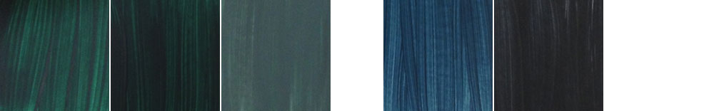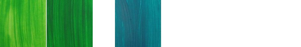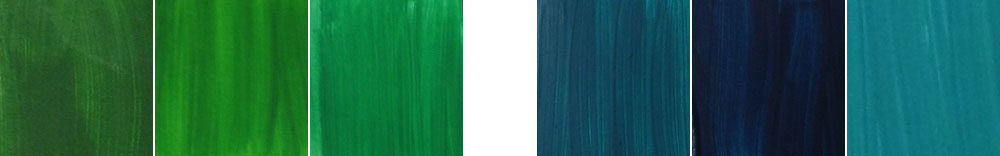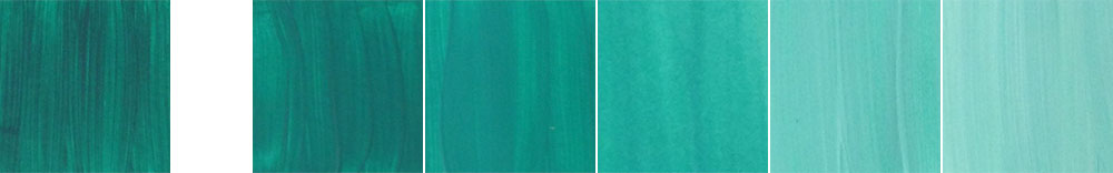 Выпускают два тюбика смеси зеленого и синего фталоцианинов — изумрудная и бирюзовая. Оба заметно разбавлены белилами, друг от друга отличаются незначительно.
