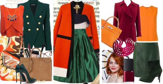 Темно-зеленый и оранжевый – если вы захотите сделать образ ярким и запоминающимся. Такое сочетание всегда поднимет настроение, хоть это повседневный образ, элегантный или вечерний – он пленяет своей независимостью, игривостью.