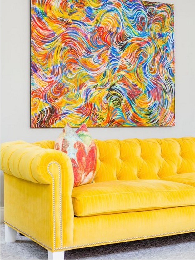 По визуальному восприятию желтый диван близок красному или бирюзовому, так как моментально притягивает взгляд. Если ваша цель состоит именно в том, чтобы сделать его центральным элементов в комнате, то старайтесь не использовать этот колер в других предметах интерьера либо используйте более блеклые оттенки.